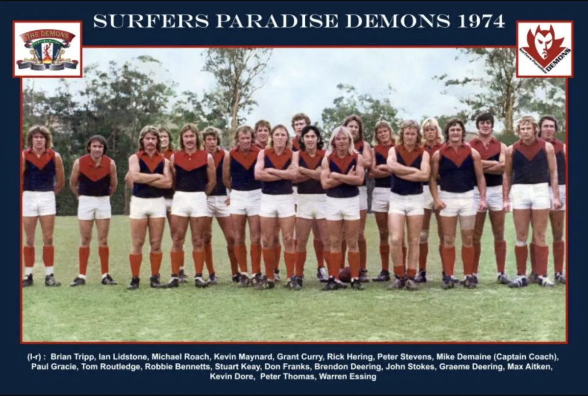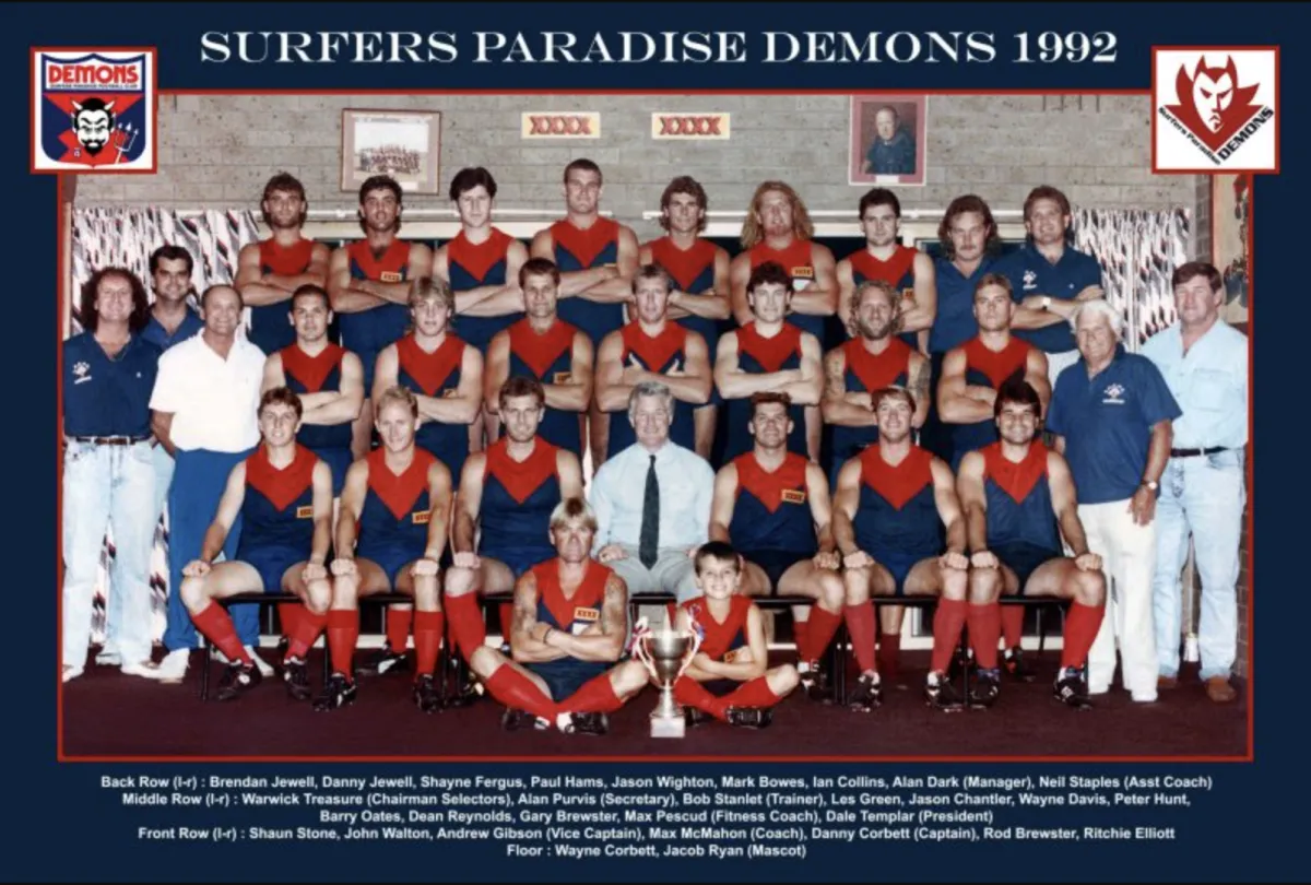 Max McMahon was appointed senior coach in 1992 and he secured a Premiership in his first year. It was followed by a five-point loss in the 1993 Grand Final. The 1992 forward line that included Andrew Gibson a former Williamstown star forward, Gibson kicked 525 goals for the club in 78 senior games, an average of 6.5 goals per game. Half Forward Barry Oates starred in the 1992 finals series kicking 17 goals including 8 goals in the Preliminary Final against Burleigh Heads. Oates also went on to win the league’s Most Valuable Player award voted by the League’s coaches. Centre an Rod Brewster capped off a great season with selection into the Queensland state side. Ruckman Paul Hams won the club Best & Fairest Award with Oates runner up. During 1996, the then Captain/Coach David Cameron kicked twenty-five goals in a game.