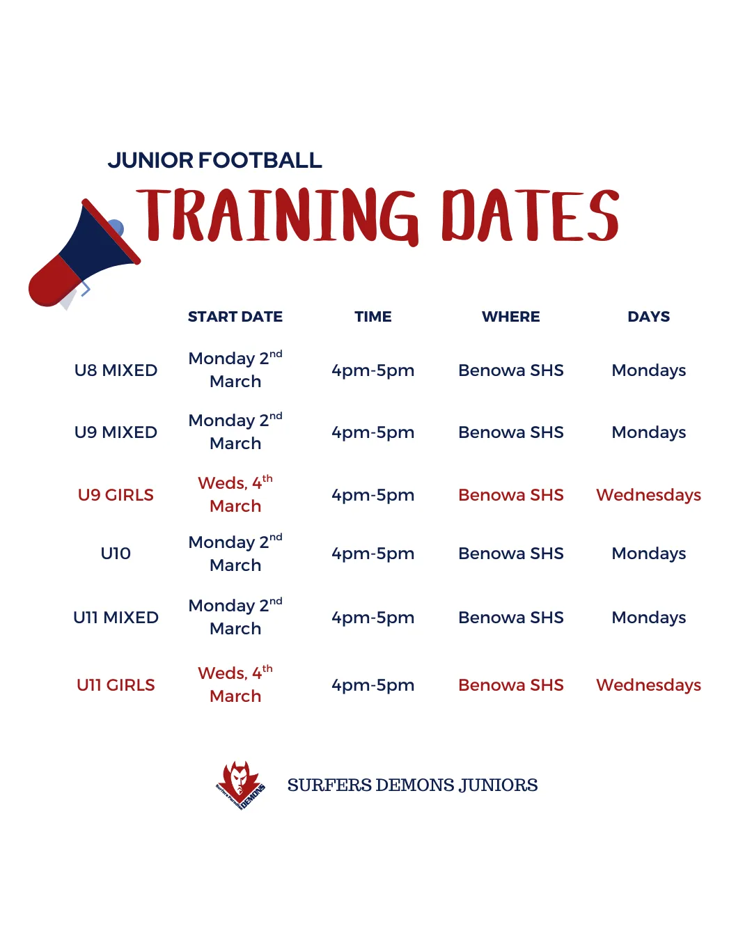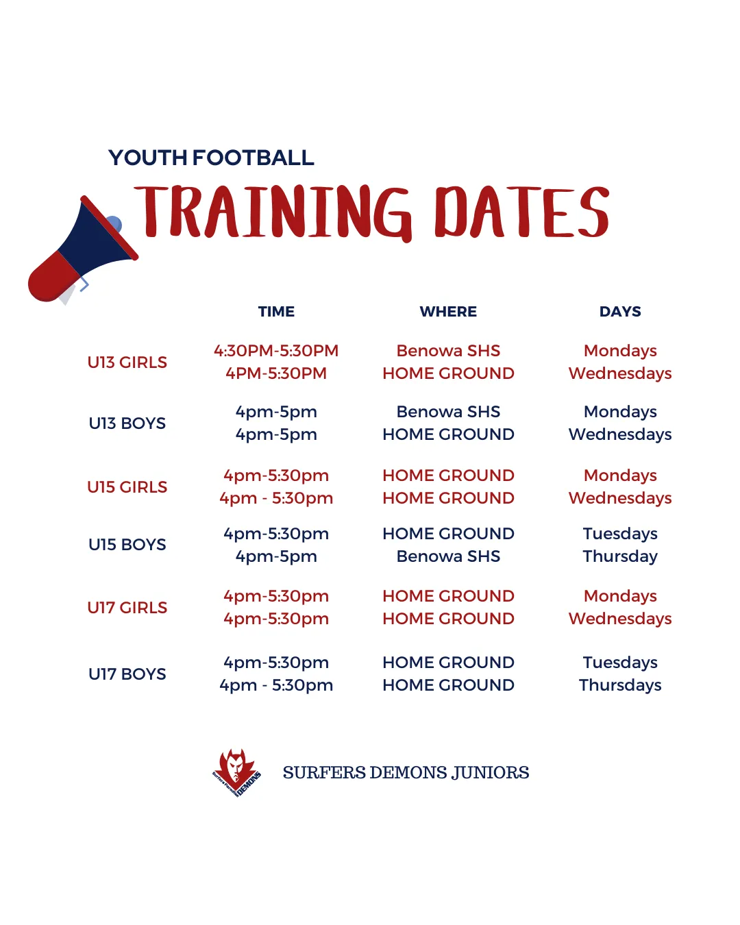Please note that the first 4 weeks of the competition for YOUTH FOOTBALL (U13-U17) are GRADING MATCHES to determine their level in the competition (which division they will sit in). The remainder of the season dates and time will be released after Game 4.